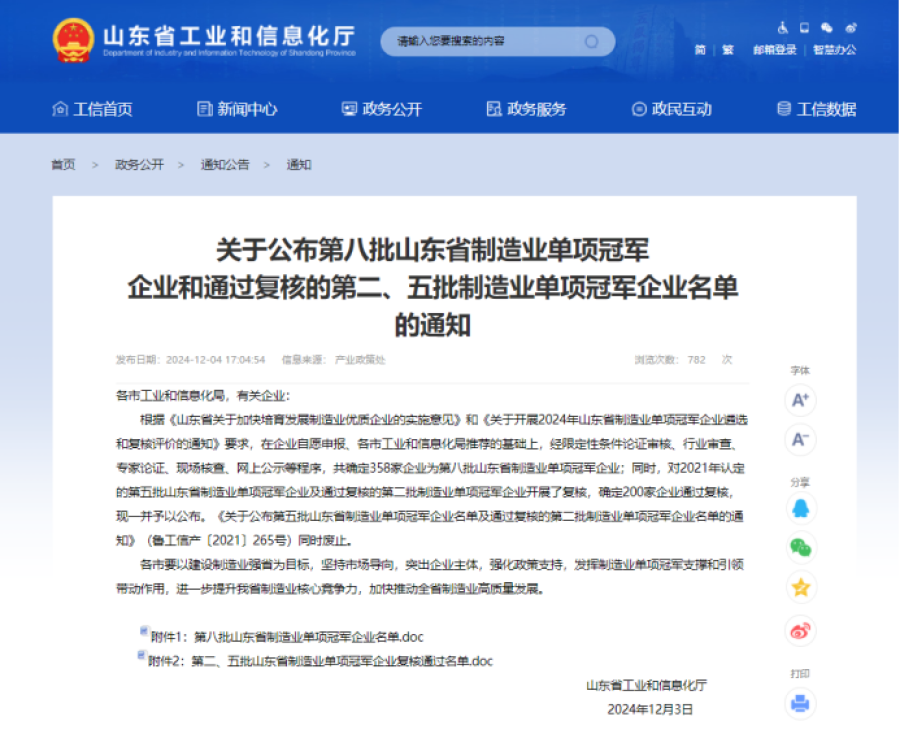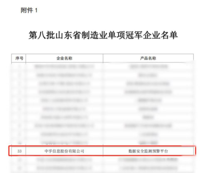 2024年12月4日,山东省工业和信息化厅公布第八批山东省制造业单项冠军企业名单,经限定性条件论证审核、行业审查、专家论证、现场核查、网上公示等程序,K8凯发(中国)信息股份有限公司凭借自主研发的“数据安全监测预警平台”在同行业内的领先优势,荣获山东省制造业单项冠军企业称号。